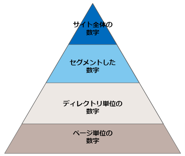 リニューアルを評価する際には、下図のようなイメージで、「サイト全体の数字」→「セグメントした数字」→「ディレクトリ単位の数字」→「ページ単位の数字」という掘り下げ方がお勧めです。