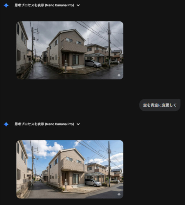 完成時期や引き渡しの都合で、どうしても曇り空や雨の日に撮影せざるを得ない現場は多いはずです。そんなときは、Geminiに画像をアップして、次のように指示するだけです。