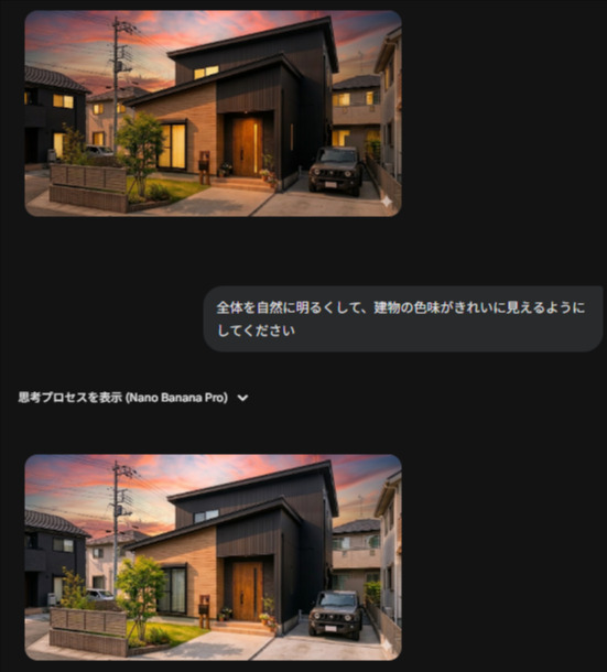 Geminiは非常に便利ですが、やりすぎると「CGっぽさ」が出てしまいます。施工事例写真で大切なのは、映えすぎることではなく、実際の家の良さが伝わることです。