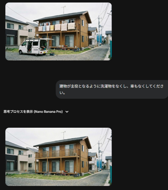 住宅街での撮影では、電線や電信柱が写り込むのは避けられません。しかし、施工事例として見ると、建物に視線が集中せず、どうしてもごちゃっとした印象になります。この場合も、Geminiに「電線や電信柱を自然に消してください」と指示するだけ。