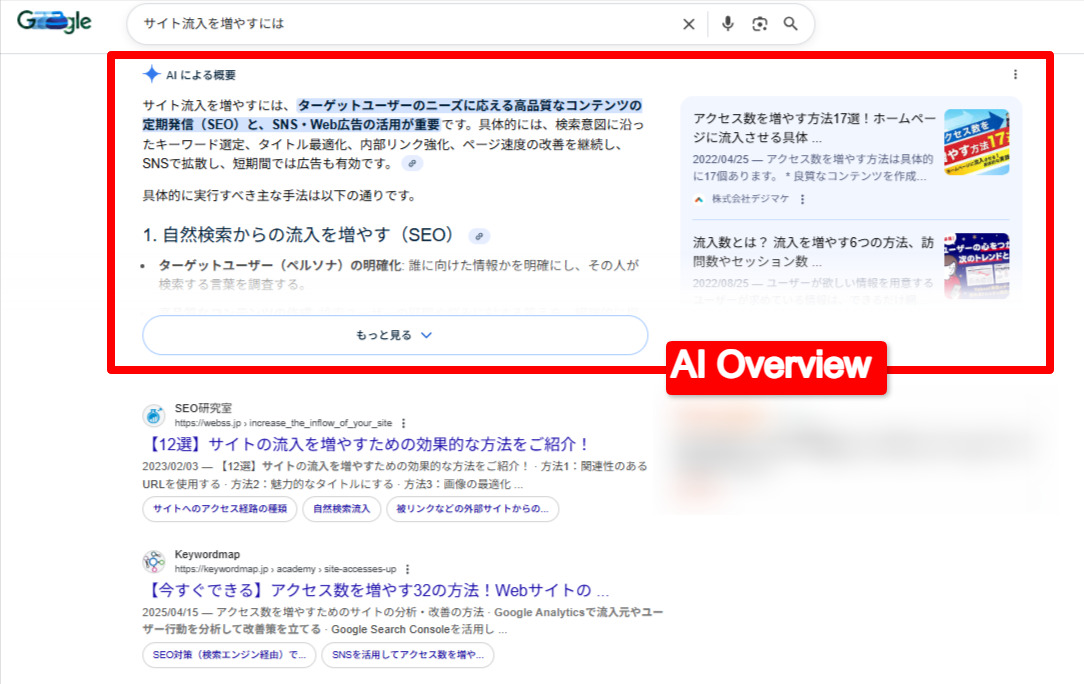 AI Overviewとは、Google検索で表示されるAIが複数のWebサイトを参照して生成した要約回答のことです。頭文字が一緒なのですが、