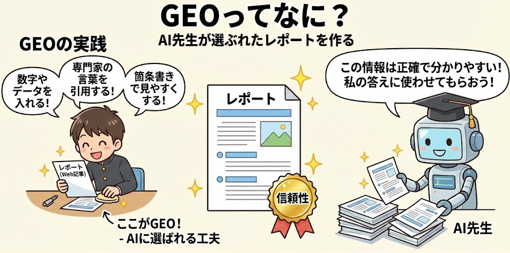 GEO(ジェネレーティブ・エンジン・オプティマイゼーション)とは、ChatGPTやGeminiなどのAIが生成する検索結果や回答文に、自社の情報が引用元として選ばれるためのマーケティング手法です。