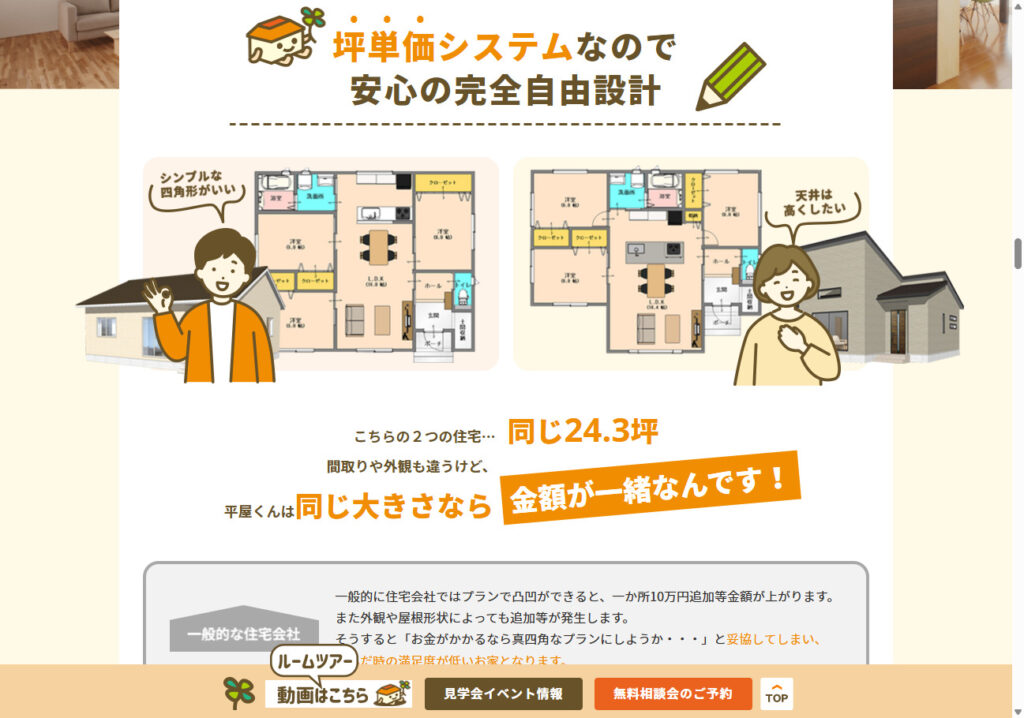 まず取り組んだのは、ホームページの第一印象を左右するトップページの改修です。キャッチコピーは従来の情報型から、ユーザーの悩みや希望に直結するような表現に変更。さらに、ルームツアー動画や最新イベントを目立つ位置に配置し、訪問者が思わずクリックして先に進みたくなる構成へと作り替えました。